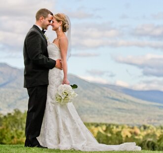 The backdrop at the Mountain View Grand Resort in Whitefield, New Hampshire, was the perfect nod to this nature-loving couple’s lifestyle. With an open-air ceremony and a reception location with views of the mountains, their 175 guests always had a view of the great outdoors the couple loves so much.